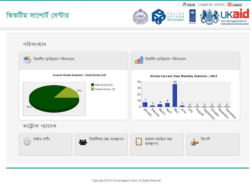 The main purpose of this system is to develop Computerized Database for Victim Support Centre (VSC). By this system VSC authority will make their entry of victim’s personnel information, history of victimization, accused or suspect information very easily with no error, authority can maintain/control their regular information time to time through Database Software, they will get total information by the single (mouse) click like date wise (Daily, Monthly, Quarterly, Half-yearly and Yearly) number of victims received services from VSC by the extensive reporting system.