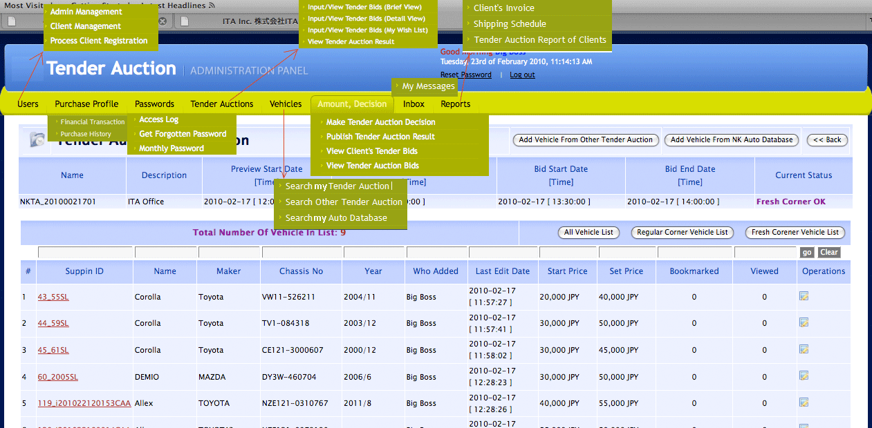 This is an Online Tender Auction and Online Live Auction for Vehicles, where the registered users can bit for a vehicle from anywhere in the world. Wallet Management, User Specific Roles, hierarchical client concepts, auto decision from